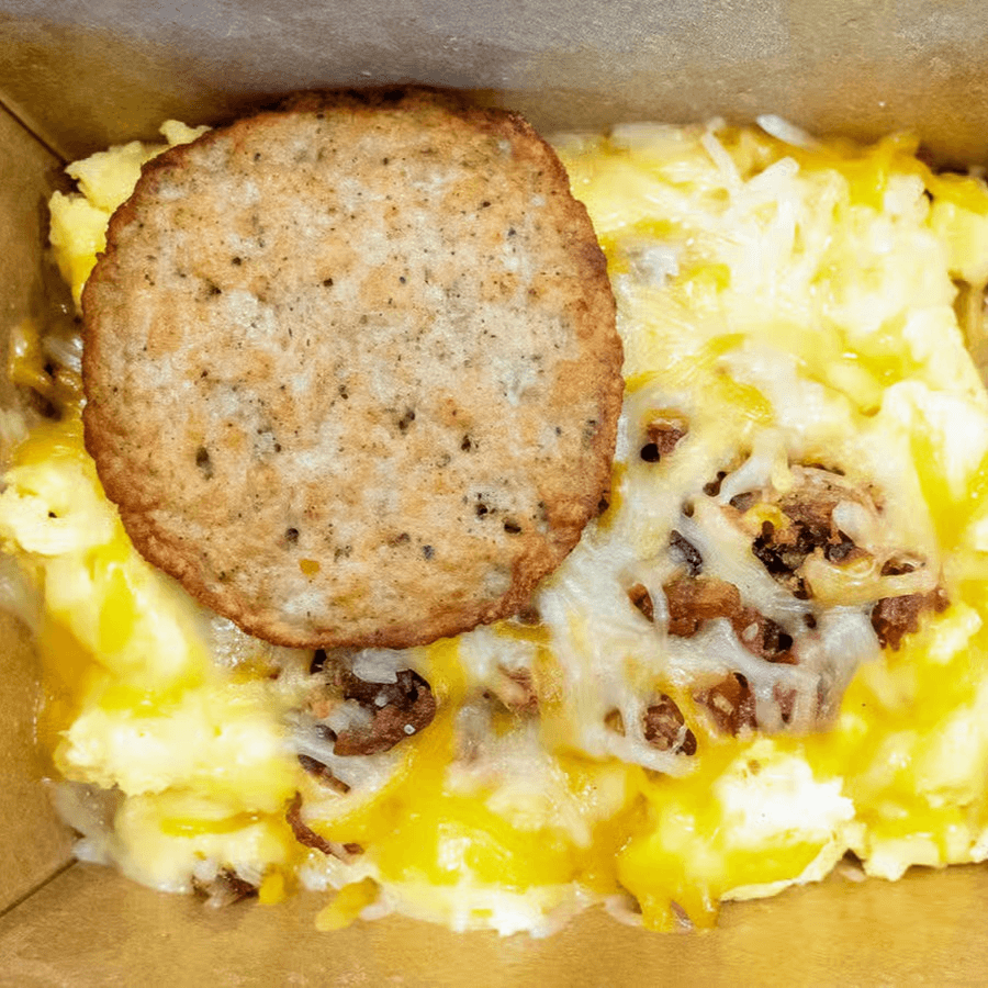 3 Eggs, Sausage, Bacon, Tater Tots, Cheese